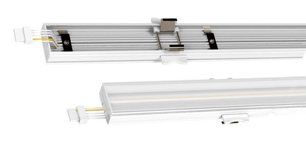 LED Lichtband Batten für die Sanierung der gängigsten Lichtbandsysteme mit ein- und zweiflammigen T5- und T8 Leuchten. Die universelle Click-Verriegelung ist kompatibel mit den Systemen: Ridi, RZB, Siteco, Trilux, Philips, Thorn, Zumtobel, Litelicht, Ludwig, Regiolux, Siemens. Zum elektrischen Anschluss hat die Leuchte eine integrierte 5-polige Durchgangsverdrahtung incl. Verbindungsstecker. Der verbaute Philips-Converter erlaubt 4 einstellbare Leistungsstufen (20/25/32/38/48/60/68W - bis 10'500lm). Da die Kompatibilität nicht bei allen Tragschienen zu 100% gewährleistet ist, empfehlen wir die vorherige Bemusterung.